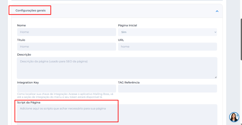 No campo script da página cole o código abaixo com o tempo em segundos e a URL da página que deseja redirecionar.