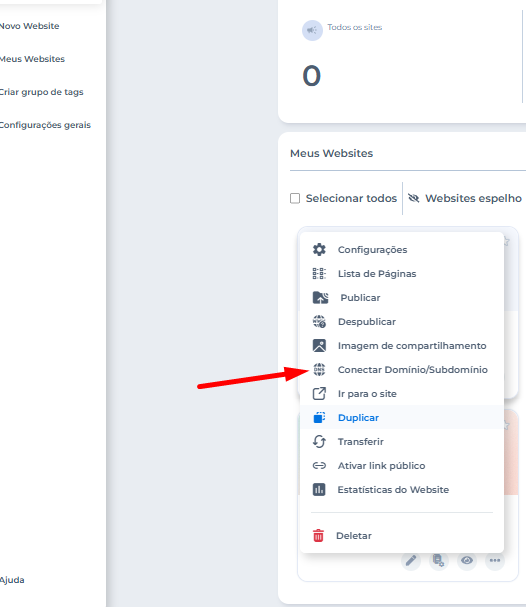 - Ou, na página principal de websites, clique nos três pontos ao lado do site escolhido e selecione “Conectar Domínio”